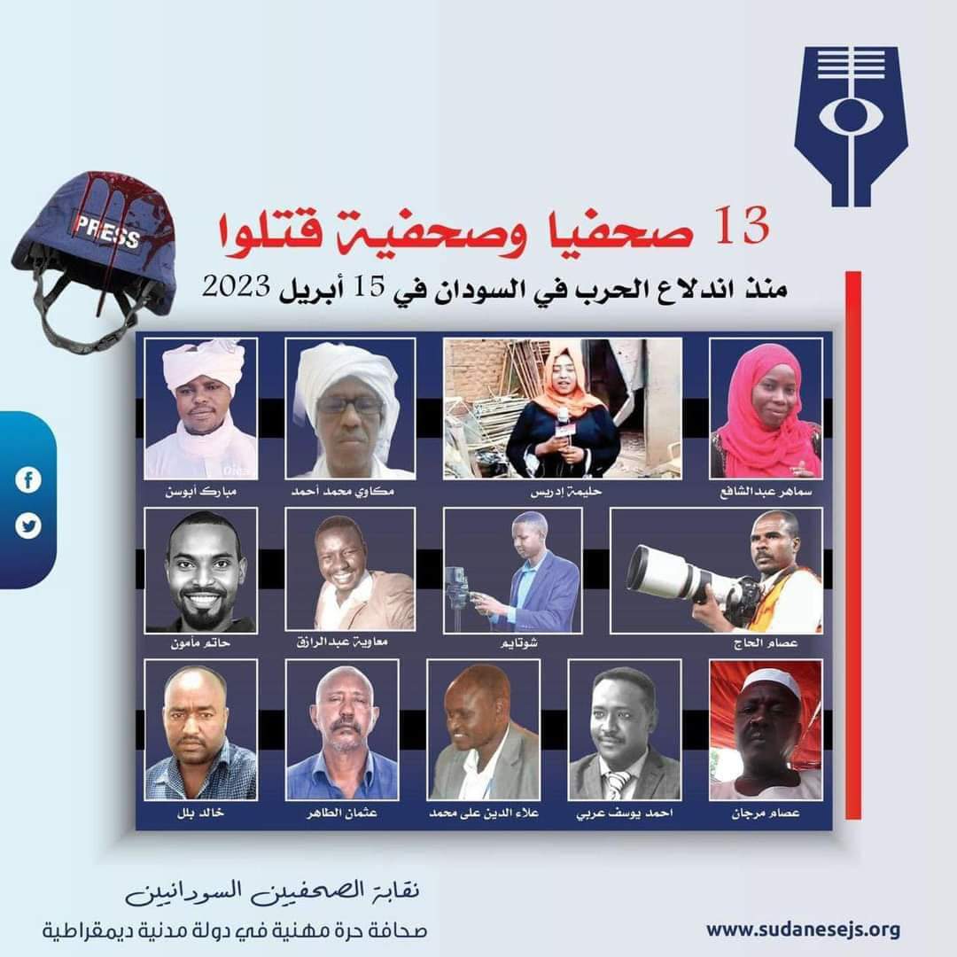 منذ اندلاع الحرب في منتصف أبريل 2023، قتل (13) صحفيا وصحفية، وأصيب نحو 27 آخرين، فيما واجه عديدون الاعتقال بتهم مختلفة، في وقت تدور الحرب في البلاد وسط غياب التغطية الإعلامية الكافية لجهة توقف عشرات المؤسسات المستقلة عن العمل وتشريد نحو ألف صحفي وصحفية.