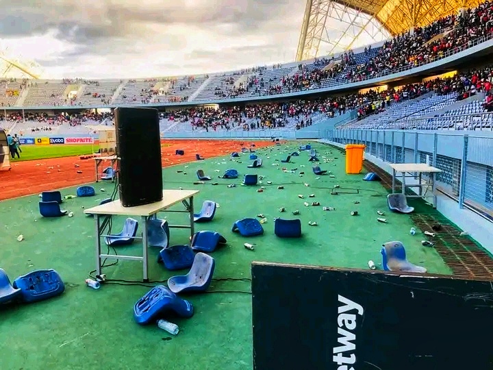 هذا الأمر لم يعجب جمهور نكانا، الذي لم يتمالك بعض منه الأمر، وبدأ في تحطيم الكراسي لتبدأ موجة واسعة نحو تحطيم كراسي الملعب.