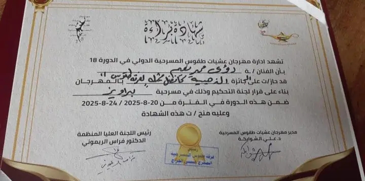 حصدت الممثلة والفنانة السودانية، رؤى محمد نعيم سعد، على جائزة أفضل ممثلة، في مهرجان مهرجان عشيات طقوس المسرحية الدولي.