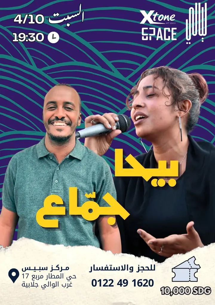 يشهد مركز سبيس في السابعة والنصف من مساء اليوم السبت، بحي المطار، الوالي جلابية، غرب سكن المصفاة، بمدينة بورتسودان شرقي البلاد، حفل غنائي للفنانة تسابيح الأمين والفنان إبراهيم جمّاع.
