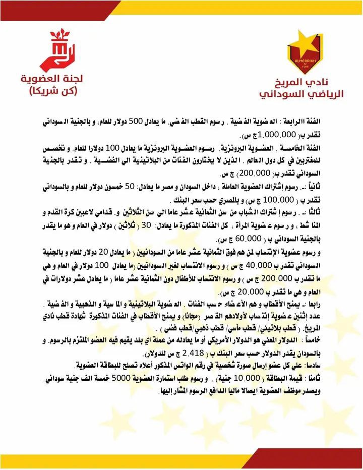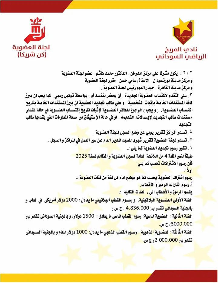 تبدأ بألفي دولار.. المريخ يحدد مراكز تجديد وإكتساب العضوية الجديدة داخل وخارج السودان