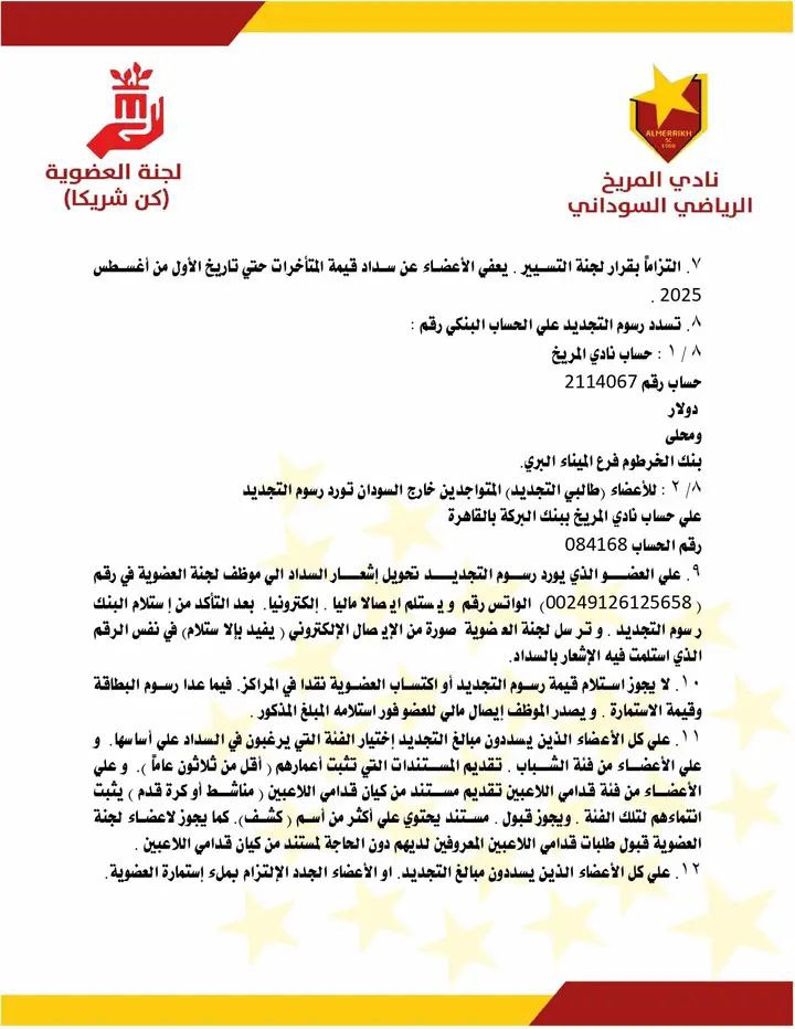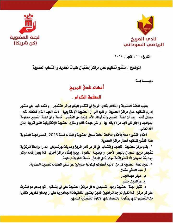 أعلن نادي المريخ، عن مراكز استقبال طلبات تجديد العضوية، وإكتساب العضوية الجديدة، مع إرجاء العضوية الإلكترونية إلى وقت لاحق، لمزيد من التشاور والتنسيق.
