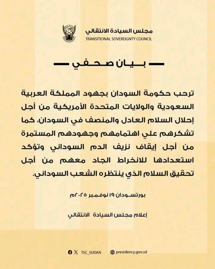 في هذا الوقت، أعلن مجلس السيادة السوداني استعداده للتعاون مع الولايات المتحدة والمملكة العربية السعودية بهدف تحقيق السلام المنشود للشعب السوداني، ورحب المجلس، في بيان، بالجهود المبذولة من قبل الدولتين لإرساء سلام عادل في السودان.
