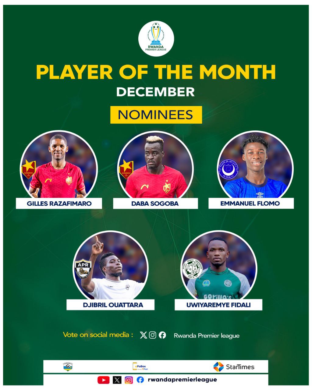 ينافس فريقيا الهلال والمريخ، على الجوائز الفردية لشهر ديسمبر 2025، في منافسة بطولة الدوري الرواندي، بحسب إعلان رابطة الدوري.