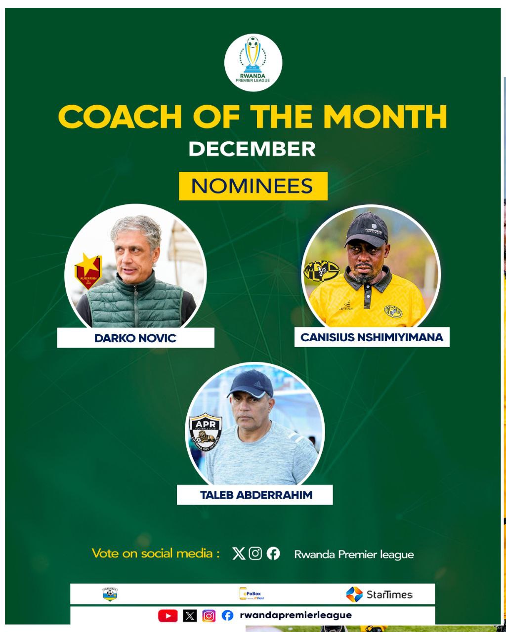 ينافس مدرب فريق الكرة الأول بنادي المريخ، الصربي دراكو نوفيتش على جائزة أفضل مدرب، إلى جانب الرواندي كانيسيوس نيشاميانيا، مدرب نادي موكورا، والمغربي عبد الرحمن بن طالب، مدرب نادي الجيش.