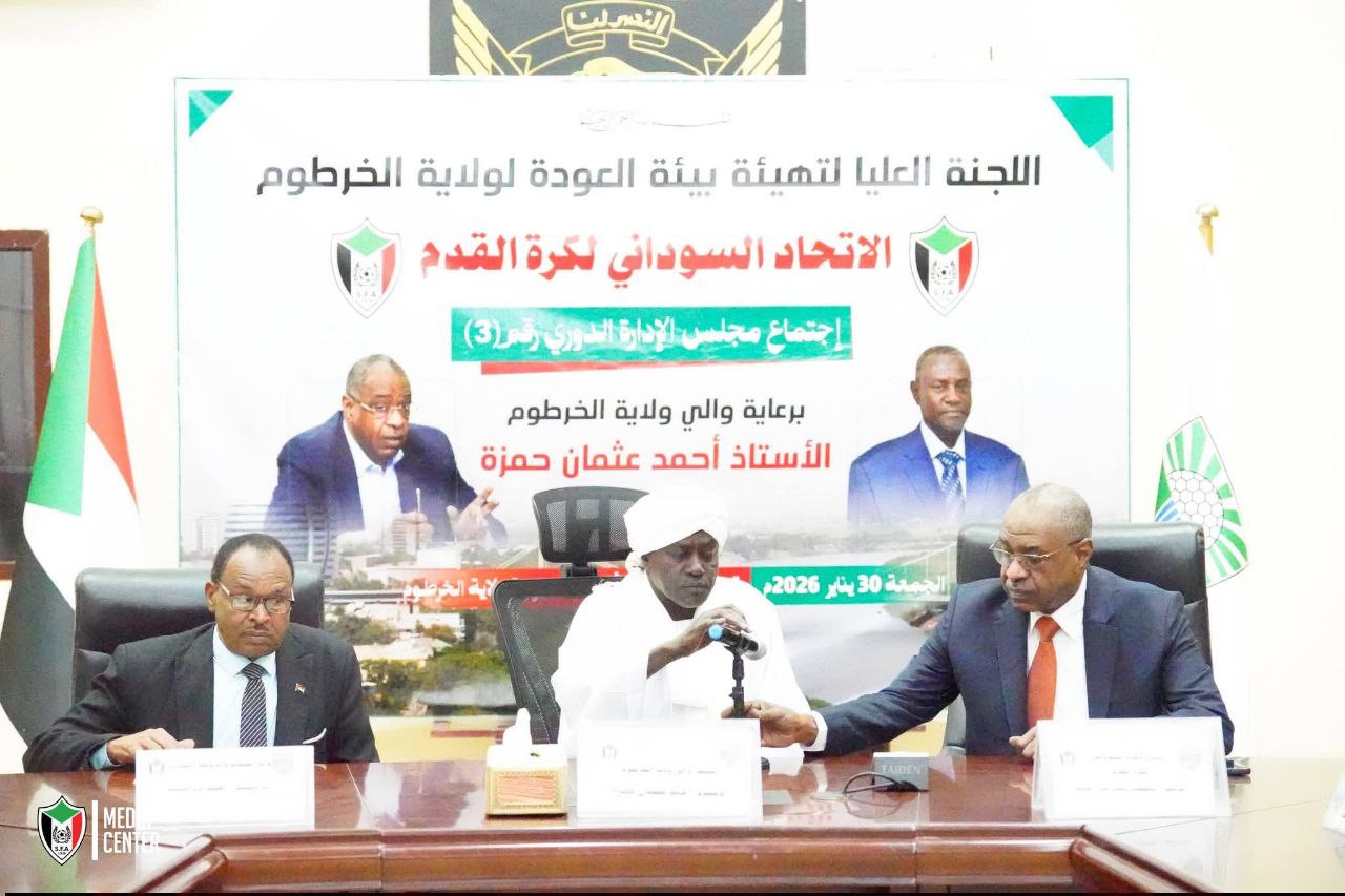 عقد مجلس إدارة الاتحاد السوداني لكرة القدم اجتماعه الدوري رقم (3) يوم الجمعة 30 يناير 2026م بمدينة الخرطوم ، برئاسة الدكتور معتصم جعفر وبحضور عدد كبير من الاعضاء، وبرعاية كريمة من السيد والي ولاية الخرطوم، وبحضور السيد وزير الشباب والرياضة الاتحادي المكلّف، في خطوة تعكس عودة الأنشطة الرياضية إلى العاصمة ودورها في دعم الاستقرار الوطني.