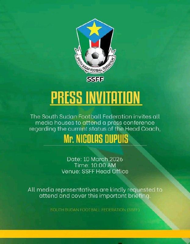 أعلن اتحاد جنوب السودان لكرة القدم، عن عقد مؤتمر صحفي مرتقب في تمام الساعة العاشرة من صباح غدٍ الثلاثاء، وذلك لوضع النقاط على الحروف بشأن أزمة غياب المدير الفني للمنتخب الوطني، الفرنسي نيكولاس دبوي.