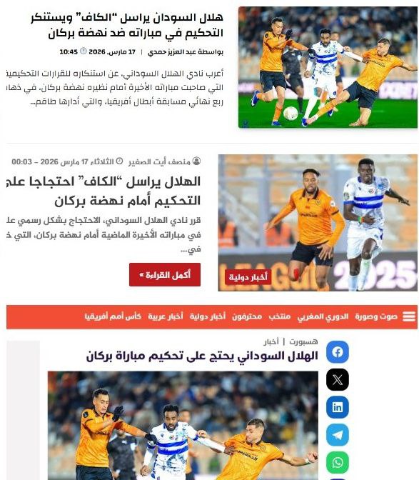 سيطرت حالة من الترقب والحذر على المنصات الرياضية المغربية عقب تأكيد نادي الهلال السوداني تقديم شكوى رسمية مدعومة بمقاطع الفيديو إلى الاتحاد الأفريقي لكرة القدم (كاف) احتجاجاً على القرارات التحكيمية في ذهاب ربع نهائي دوري أبطال أفريقيا.