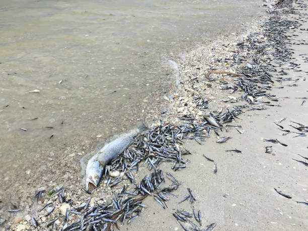 Toxic algae also known as red tide causes fish of all sizes to wash up dead next to seashells on Fort Myers Beach and other west coast cities in Florida, USA.