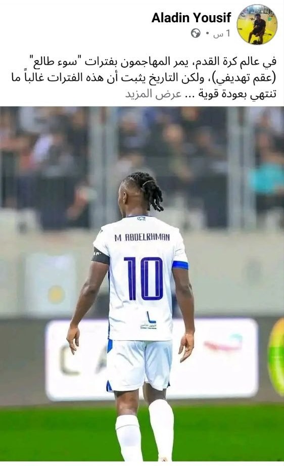 وجه نجم وسط نادي الهلال والمنتخب الوطني السابق، علاء الدين يوسف “فييرا”، رسالة مؤثرة عبر حسابه الرسمي على منصة فيسبوك، دعا فيها جماهير النادي الأزرق لمساندة قائد الفريق محمد عبد الرحمن “الغربال”، في ظل ما وصفه بـ(فترة سوء طالع) تهديفي يمر بها اللاعب مؤخراً.